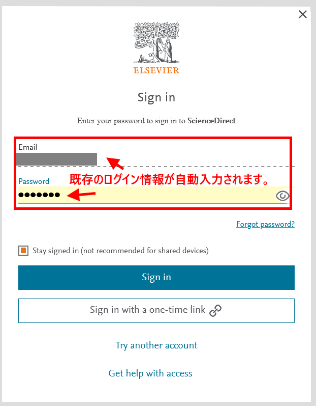 注)登録されたメールアドレスが不明(あるいは無効)でパスワードのリセットができない場合は、こちらのフォームよりElsevierのScienceDirectサポートセンターにお問い合わせください(日本語可)。