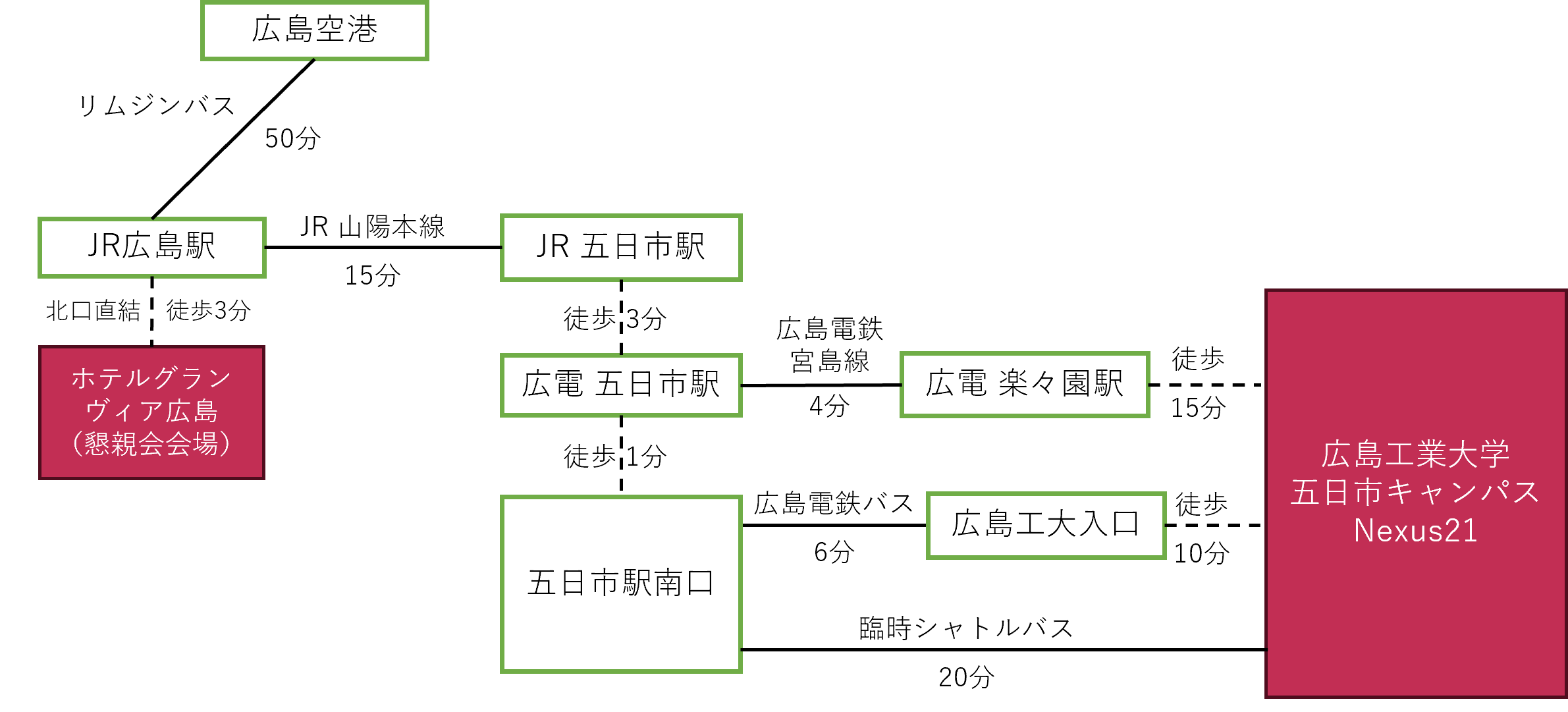 - 広島工業大学から懇親会会場へのシャトルバスはございません。JR五日市駅へのバスを増便しておりますので、余裕を持ってご利用ください。