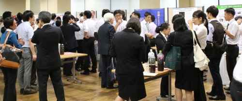 交流サロンでは、(株)chromocenter、アサヒグループホールディングス(株)、味の素(株)、バイオ・ファイン研究所、江崎グリコ(株)、大関(株)、カネカ(株)、菊正宗酒造(株)、キユーピー(株)、キユーピー醸造(株)、霧島酒造(株)、月桂冠(株)、サントリーグローバルイノベーションセンター(株)、白鶴酒造(株)、ヤヱガキ醗酵技研(株)の計13社に加えて、大阪産業技術研究所、京都市産業技術研究所、京都バイオ計測センター、奈良県産業振興総合センター、和歌山県工業技術センターの4つの公設試にポスターを展示していただき、研究員・技術者の方に、開発した技術や製品について、開発者のやりがい、こだわり、苦労話を熱く語っていただきました。予定を大幅に超える180名近い方に参加していただき、出展企業からご提供いただいたお酒・ドリンクを飲みながら、時間を忘れて話がはずみました。来聴者にも出展していただいた企業・公設試の方からも大変好評で、今後も継続したい企画にすることができました。